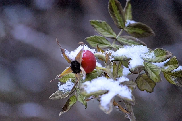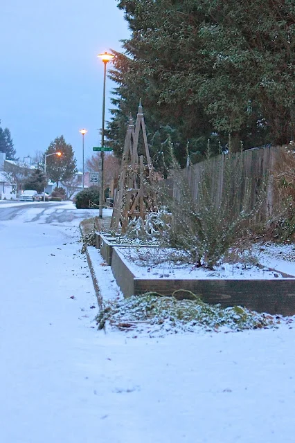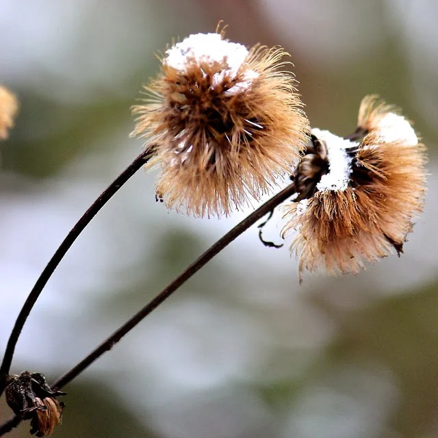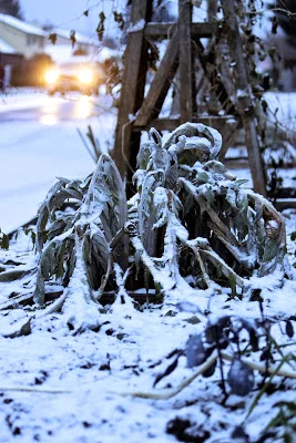 A light snow with some ice pellets fell and I ran outside with my camera to capture the transformation. Tomatillo skeletons are beautiful when they are glazed with frost or snow.